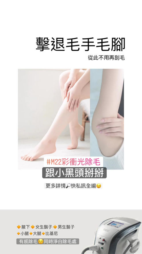 傳統除毛方式是暫時性除毛,很容易因為過度刺激除毛部位,造成色素沉澱的疤痕,以及產生皮膚粗糙、毛囊炎等情況,所以建議使用雷射除毛,其方式能夠短時間有效破壞毛髮的再生能力,透過完整的療程,可以告別毛手毛腳。